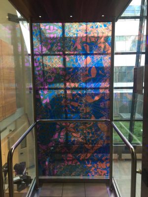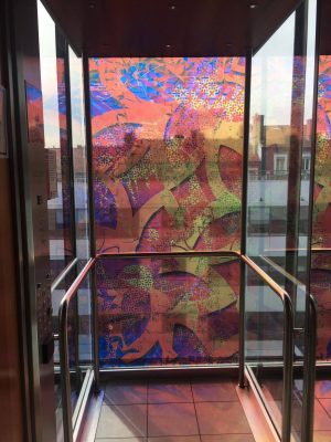 Création imprimée sur adhésifs collés sur le fond des cages d’ascenseur